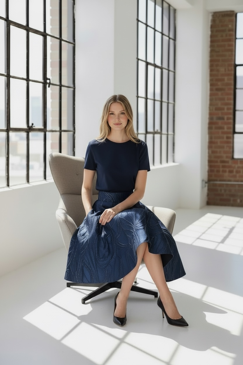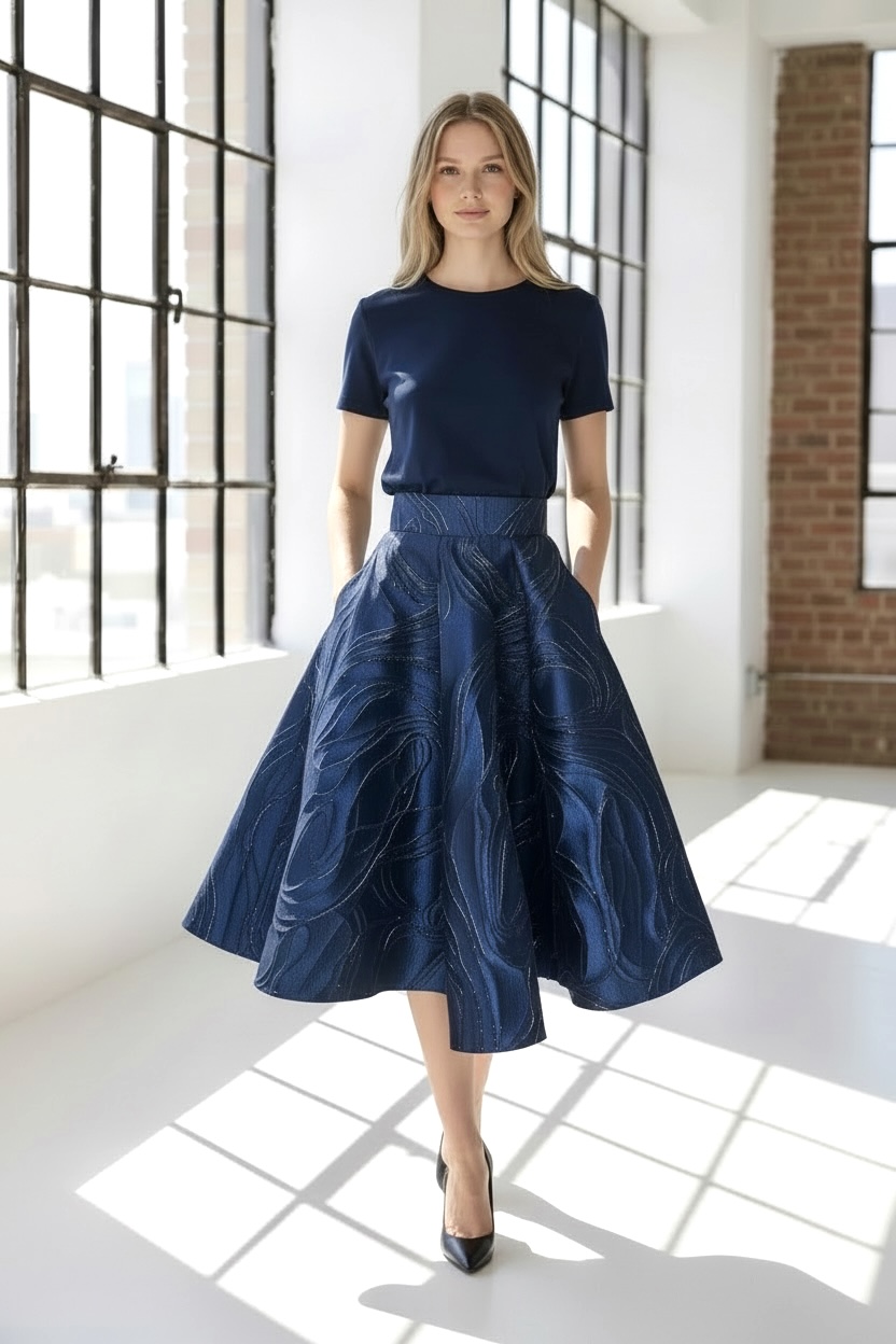 Tato žakárová sukně s elegantní délkou ke kolenům a nádherným vzorem se stane absolutní dominantou vašeho šatníku. Díky propracovanému žakárovému vzoru působí luxusně a sofistikovaně, přitom je natolik variabilní, že ji s přehledem oblečete na glamour večírek i na běžný den ve městě.