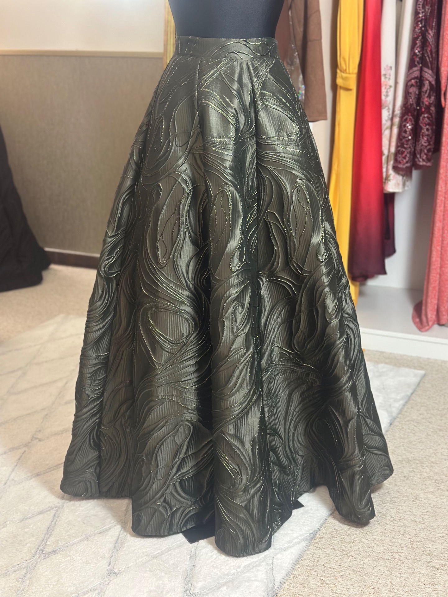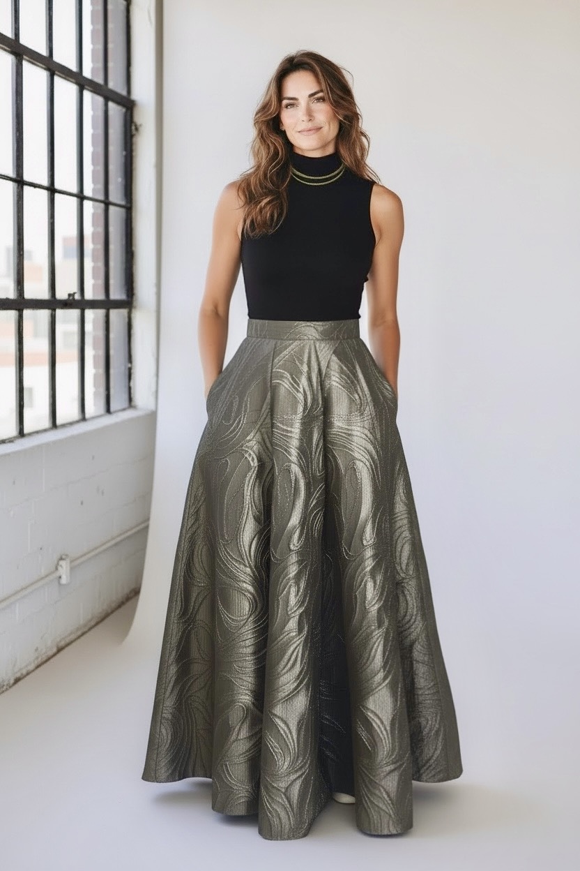 Tato dlouhá žakárová sukně s nádherným vzorem se stane absolutní dominantou vašeho šatníku. Díky propracovanému žakárovému vzoru působí luxusně a sofistikovaně, přitom je natolik variabilní, že ji s přehledem oblečete na glamour večírek i na běžný den ve městě.
